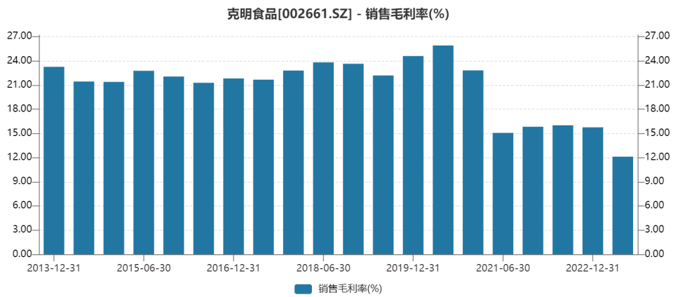 受各种因素影响,克明食品的毛利率近几年整体有着不小的下滑。