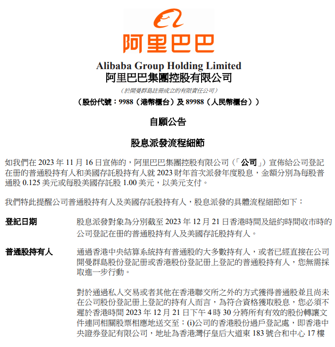 12月6日,阿里再次发布公告,披露了此次股息派发的流程细节。据悉,股息派发的对象为“分别截至2023年12月21日香港时间及纽约时间收市时的公司登记在册的普通股持有人及美国存托股持有人”。