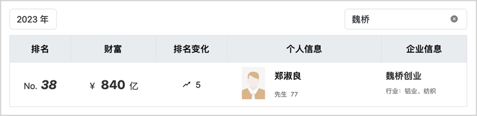 张士平长期占据山东首富的位置,魏桥集团更是当地的纳税和就业大户。2023年,张士平妻子郑淑良以840亿财富值位居第38位。