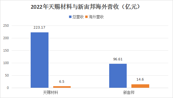 2022年新宙邦实现海外营收14.60亿元。而总营收规模是新宙邦两倍还多的天赐材料,海外营收只有6.50亿。