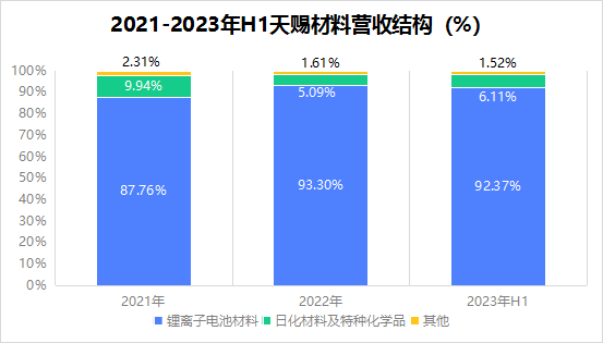 从产品结构上看,2016-2020年天赐材料锂电业务的营收占比维持在60%上下,2022年这个占比已经达到了94.7%,就是说公司几乎只出售锂电材料这一类产品。