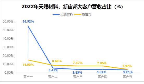 从客户构成上看,宁德时代作为天赐材料的第一大供应商,2022年贡献了过半54.52%的营收。新宙邦前五大客户销售总和的占比也不过43.29%。