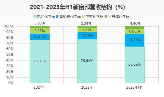 新宙邦的情况就好一些,2023上半年电池化学品的业务占比已经降到63.7%。有机氟化学品成为公司新的成长曲线,营收占比达到21.77%。