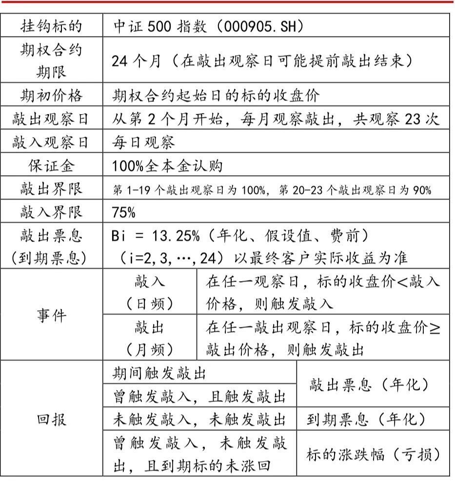 这个游戏规则看起来很复杂,简单概括起来其实就是,只要中证500指数在2年合约期限内一直高于5232.46,投资者就可拿到年化13.25%的费前收益,至于收益结算期是多长,取决于什么时候敲出,敲出的早,期限就短,反则亦然。既不敲出也不敲入,收益最大。