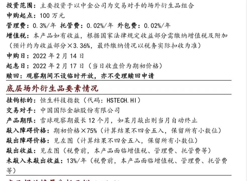 另外一个雪球挂钩恒生科技指数,合约期限1年,成立日恒生科技指数为5479.9,敲入点4109.9(安全垫25%),前半年票息年化20%,后半年13%。(合约如下图)