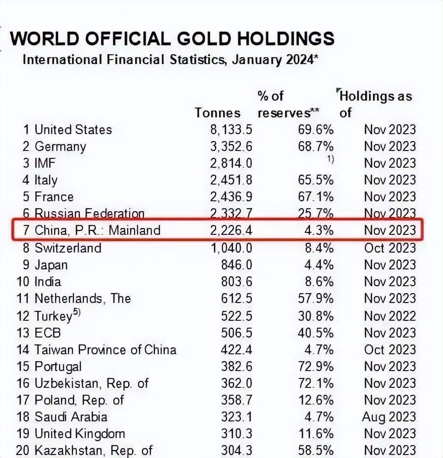 另外,世界黄金协会2024年1月公布的最新数据显示,截至2023年11月末,美国黄金储备已达8133.5吨,德国黄金储备为3352.6吨。