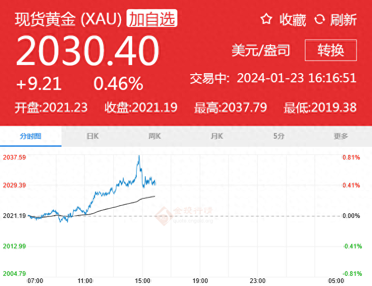 截至目前,现货黄金报每盎司2021美元。