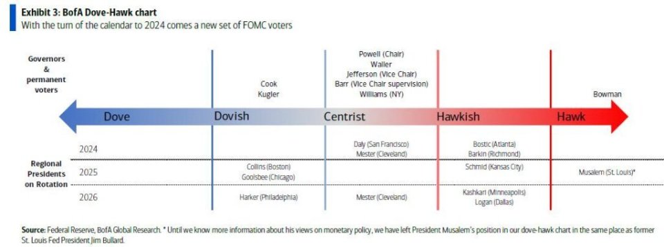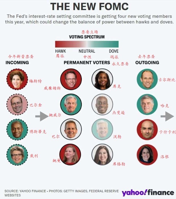 而今年将被轮换调出的是芝加哥联储主席古尔斯比(鸽派)、费城联储主席哈克(鸽派)、明尼阿波利斯联储主席卡什卡利(新晋“鹰王”)和达拉斯联储主席洛根(鹰派)。