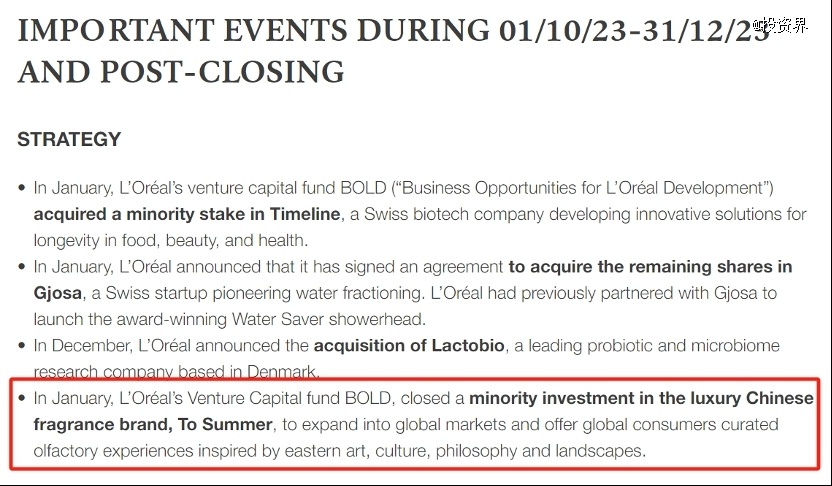 这是过去60年间欧莱雅集团首次在年报中官宣少数股权投资事件。欧莱雅集团首席全球增长官费博瑞表示:“此次对于观夏的投资是欧莱雅集团2023年在北亚市场最重要的投资之一。”