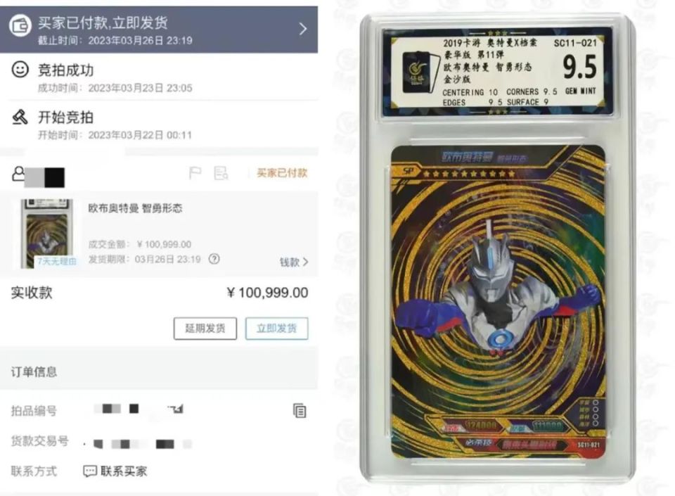 据卖家介绍,这张天价卡牌为卡游公司2019年发行的豪华版第十一弹的欧布奥特曼,智勇形态金沙版,编号是SC11-021,并经过保粹评级高达9.5分,在奥特曼卡牌圈内属于顶级稀缺卡。