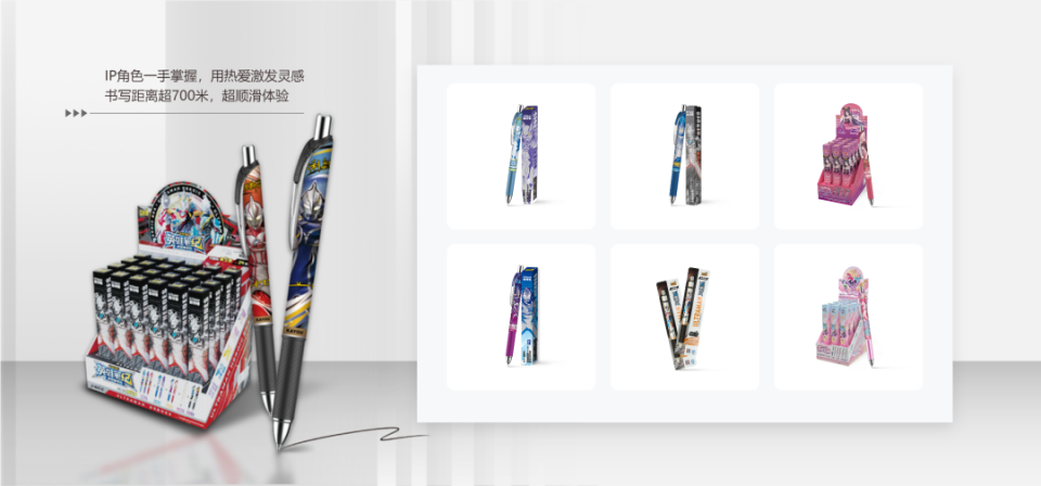和奥特曼卡牌相似,卡游文具业务打法也是文具+IP,添加了IP形象,以盲盒形式销售。