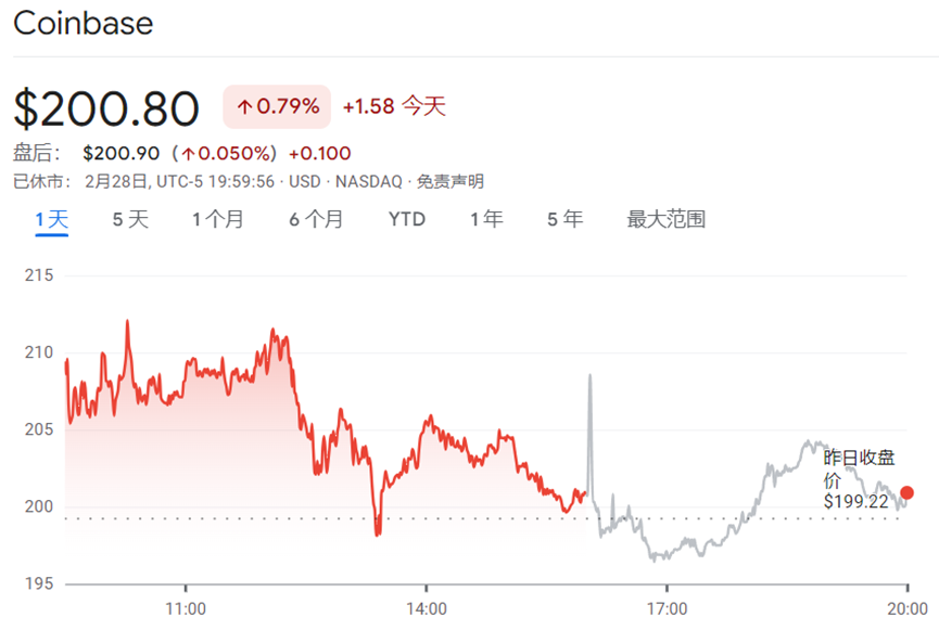 宕机被报道后,Coinbase股价从日内最高涨超6%回落,收盘时涨幅仅为0.79%。