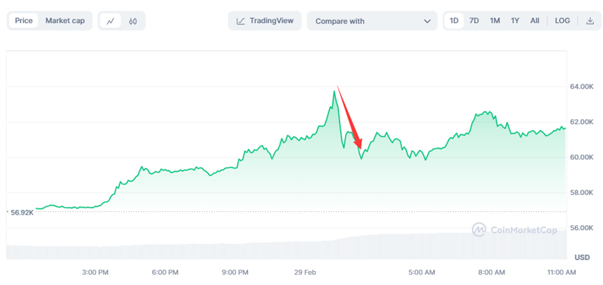 比特币隔夜美股盘中突然飙高,突破6.4万美元大关,距历史新高仅一步之遥,但随后突然跳水,几分钟之内就跌了5000美元,涨幅从最高13%收窄至一度不到6%。