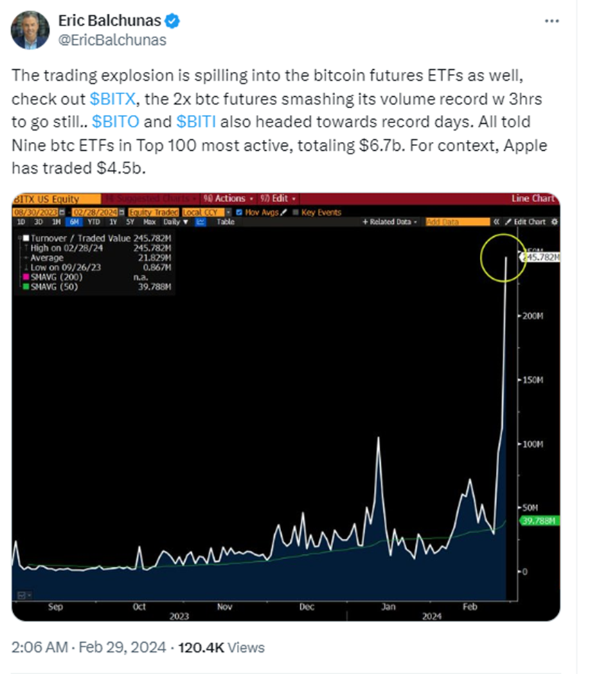 比特币期货ETF也在上演狂欢,BITX、BITO和BITI的交易量都正在迈向新的历史台阶。