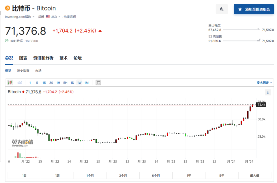 3月11日,比特币报价突破71000美元/枚,创历史新高。