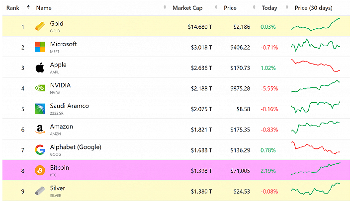据统计,比特币市值已升至1.398万亿美元,超越白银(1.380万亿美元),成为全球市值第八大资产。