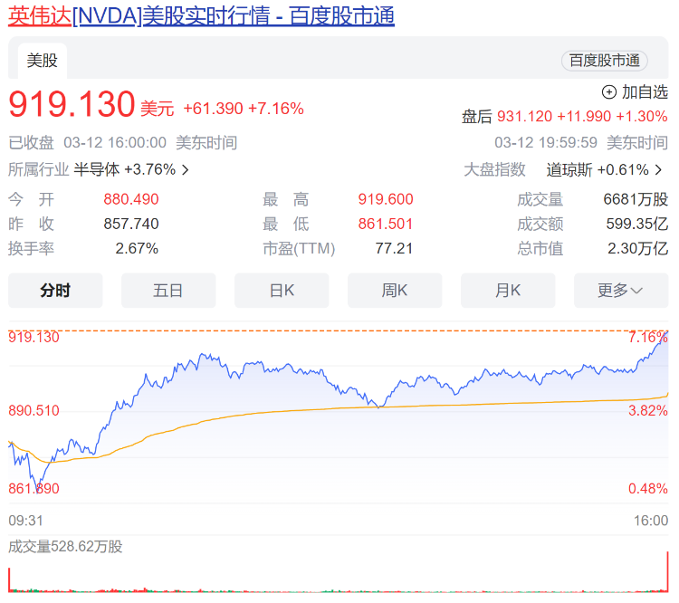 当地时间3月12日,美股芯片股重回涨势,英伟达股价大涨7.16%,收报919.13美元,单日市值增加约1535亿美元(约合人民币11023亿元),总市值2.3万亿美元。