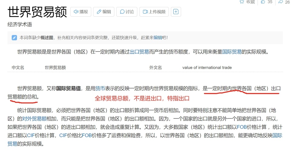 经济学家们在定义全球贸易总金额时“要求特指出口”,给出的理由是:一个国家或地区的出口,就是另外一个国家或地区的进口。未和外星人交易,地球内部交易时若采用进出口,有重复计算嫌疑。