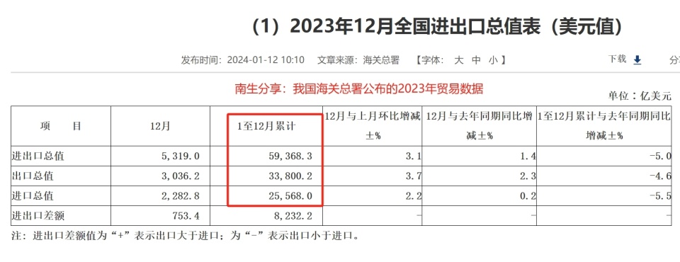 但有一部分心细的网友却感觉数据不对,我国2023年的贸易总额约为5.94万亿美元。其中,商品出口金额为3.38万亿美元,进口商品金额接近2.56万亿美元。这些都是海关总署正式公开的,截图为证!