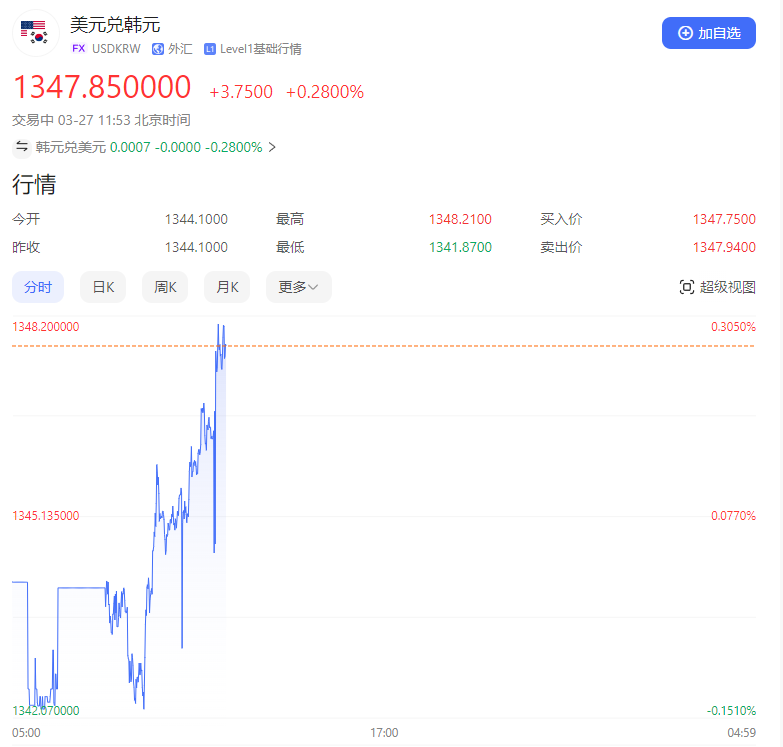美元兑韩元一度涨0.6%至1346.9,为去年11月2日以来最高水平。