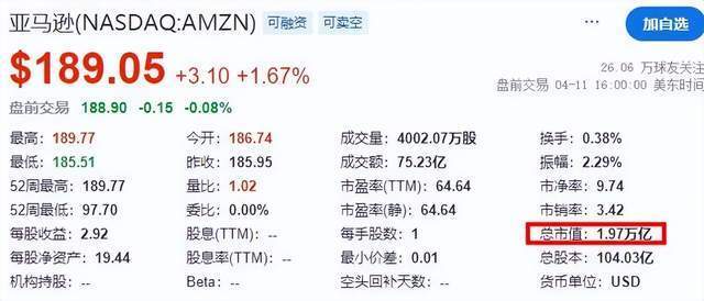 截止发稿,亚马逊总市值已达到1.97万亿美元。