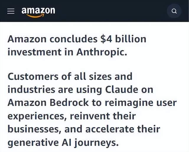 追加投资之后,亚马逊对Anthropic的总投资额将达到40亿美元,这也是亚马逊30年历史上最大的一笔外部投资。