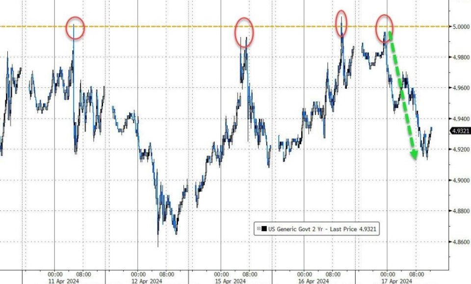 两年期美债收益率周三欧股盘前曾上测5.0%,后一度回落逾7个基点