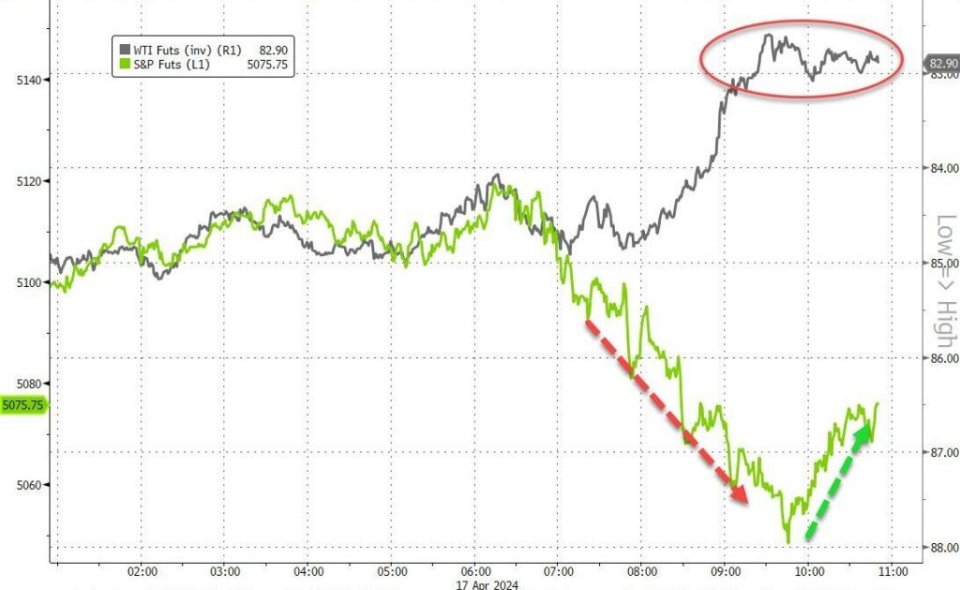 图中黑线美油价格逆转走势显示,美股盘中油价大跌之际,美股标普跌幅有所收窄