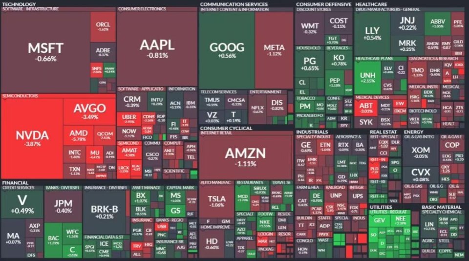 标普500各大板块中,周三共七个收跌,英伟达等芯片股所在的IT跌1.7%领跌,其他板块跌不超过0.8%,谷歌所在的通信服务跌逾0.1%,跌幅最小。四个收涨的板块中,涨超2%的公用事业领跑,必需消费品涨近0.5%,金融和材料涨0.2%。