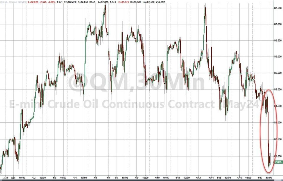 最终,原油连续三日收跌,创1月8日沙特超预期下调销往亚洲官方原油售价以来的最大日跌幅。WTI 5月原油期货收跌2.67美元,跌幅将近3.13%,报82.69美元/桶,刷新3月27日以来收盘低位;布伦特6月原油期货收跌2.73美元,跌约3.03%,报87.29美元/桶,也刷新三周来低位。