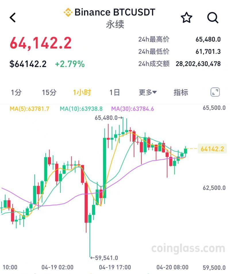 减半完成后,比特币价格小幅走高,截至发稿,比特币最新价格为64142.2美元,24小时内涨幅2.79%。其他山寨币价格也随之回升,以太坊重回3000美元关口,现报3063.12美元,24小时内微涨1.85%。根据Coinglass数据显示,最近24小时,共有超5万人被爆仓,爆仓总金额为1.63亿美元。