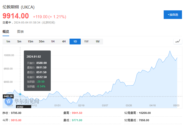 今年以来,受供给趋紧推动,铜价持续走高,伦铜累计上涨一度超16%,盘中一度涨至两年新高1万美元。