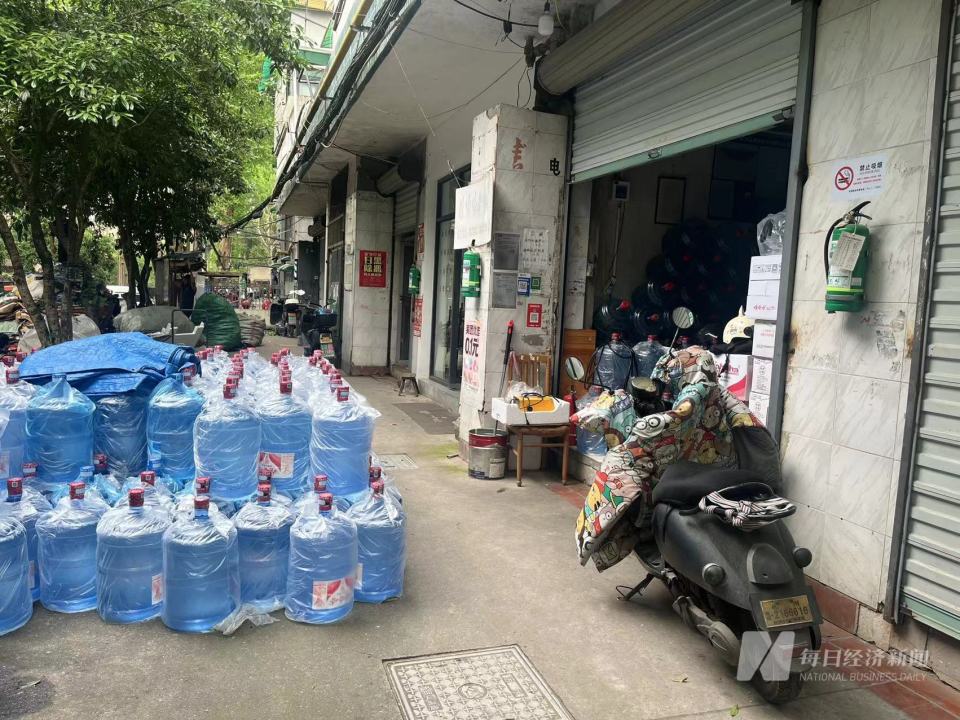 下午3点,老林的送水站门口摆放着十几只空水桶,他从店里拿出湿抹布,仔细清理水桶上的污渍。