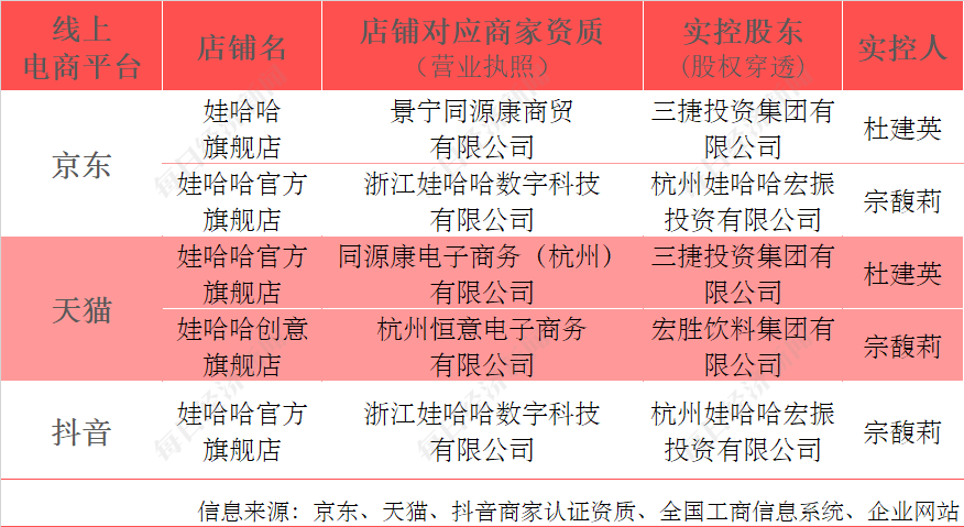 《每日经济新闻》记者查询淘宝、京东、抖音等娃哈哈线上旗舰店发现,当前娃哈哈旗舰店背后关联着不同的实控主体。