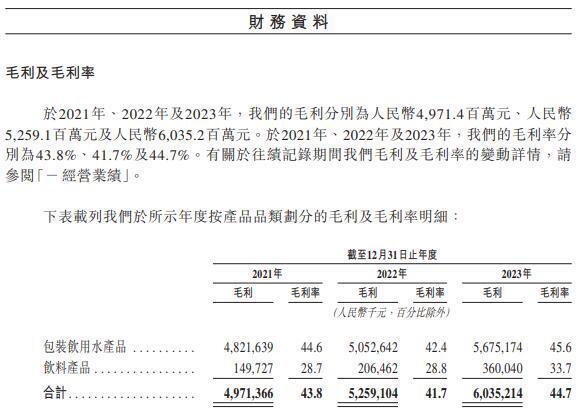 事实上,就毛利率来看,相比于其他饮料产品,包装饮用水产品的毛利率仍然是最可观的。华润饮料披露,2021年—2023年中各年度,公司包装饮水产品的毛利率分别为44.6%、42.4%、45.6%,远高于公司旗下的其他“饮料产品”。