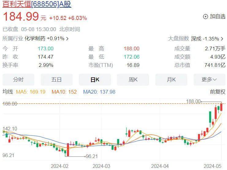 截至5月8日收盘,百利天恒报收184.99元/股,盘中创下188元/股的新高,市值超过741亿元。