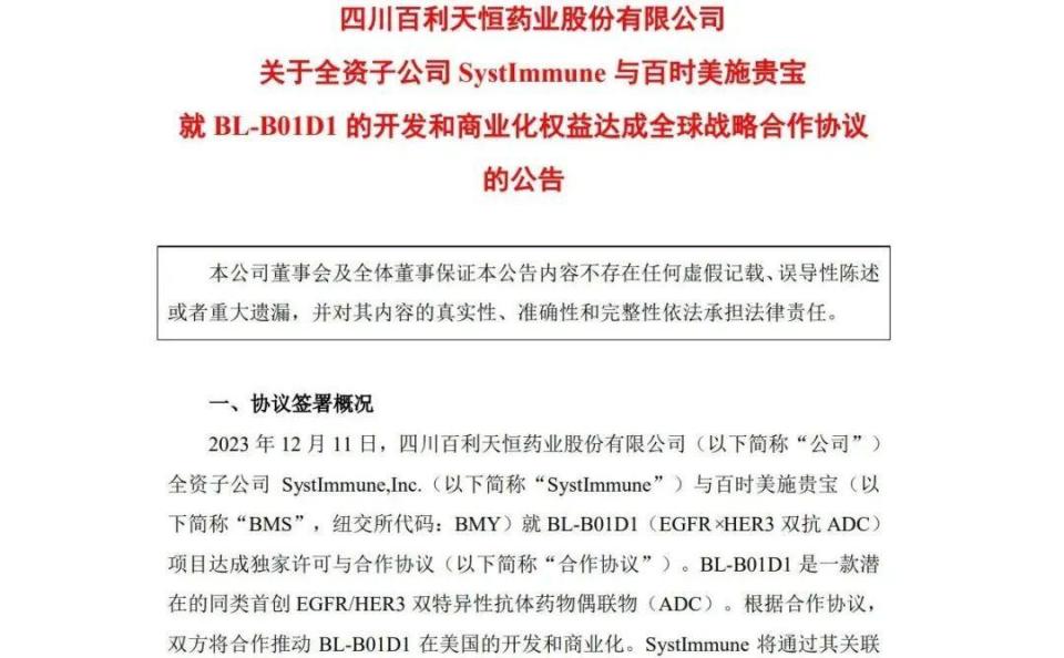 2023年末,百利天恒在美子公司SystImmune Inc.与BMS,签下独家许可与合作协议,双方合作推动百利天恒的药物BL-B01D1在美国的开发和商业化。