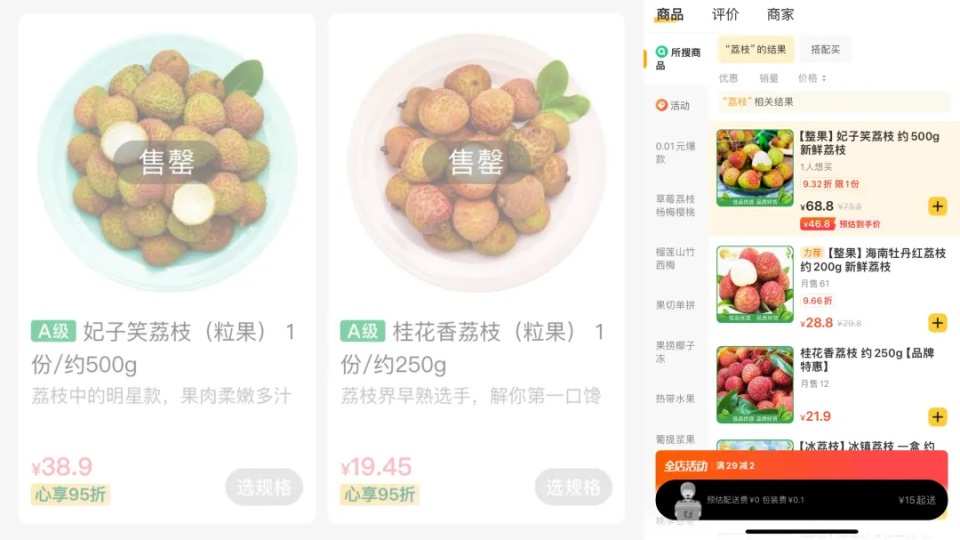 每年都会在五月网购一箱荔枝的李李,今年已经不再打起荔枝的心思了。去年,她在拼多多上买了五斤妃子笑荔枝,只花了56.8元,今年顺着历史订单再看,发现店铺都改了名字,原本专门卖荔枝的店铺,卖起了别的水果。