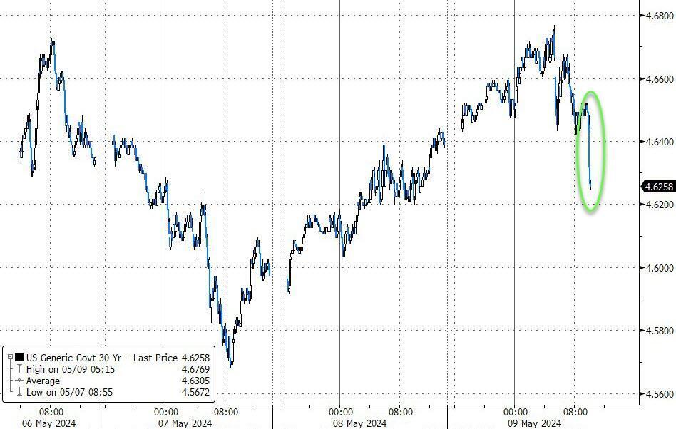 30年期美债拍卖结果出炉后,美国30年期国债收益率短线下挫超1个基点,日内整体转而下跌0.41个基点,刷新日低至4.6349%,显著脱离北京时间周四20:15美国首次申请失业救济数据发布前一刻钟涨至的日高4.6769%。