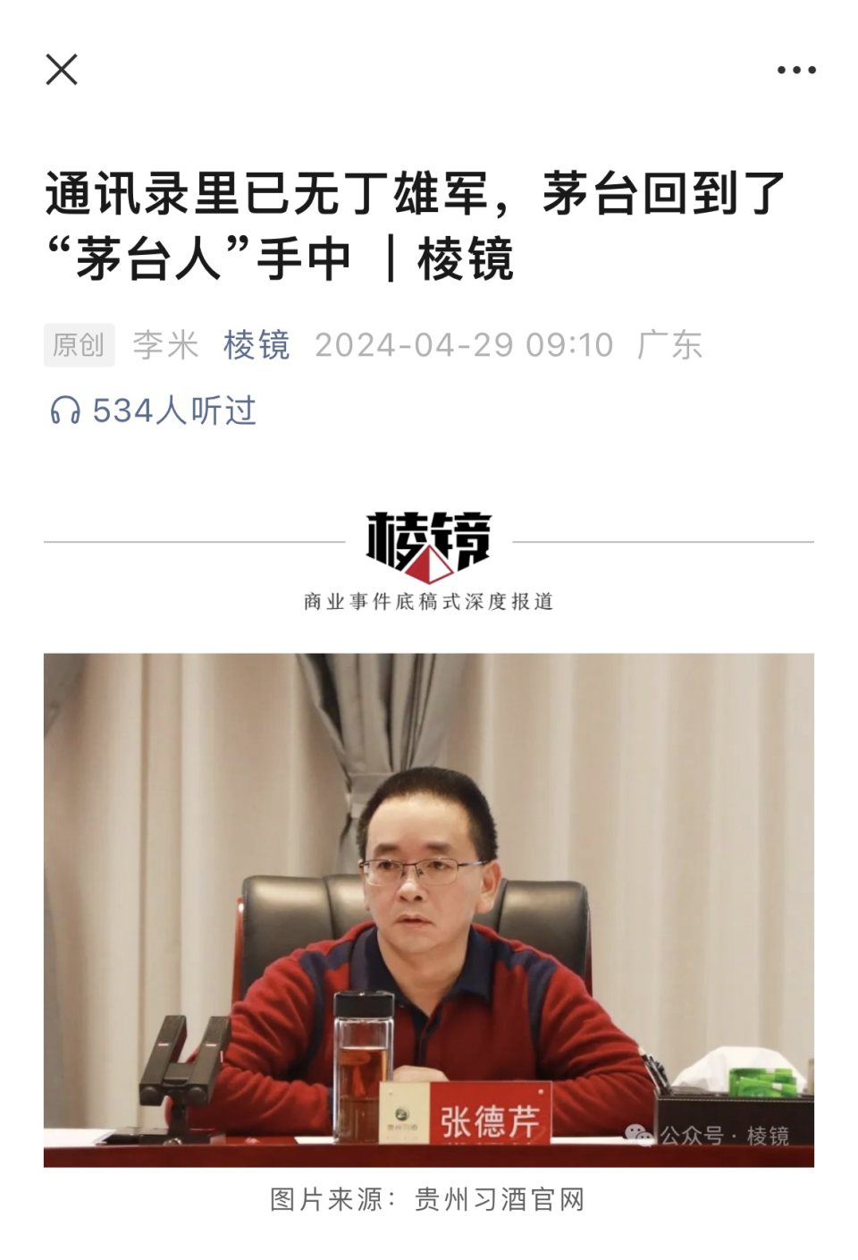 其一,4月27日,市场传出丁雄军即将离任的消息;隔天之后的4月29日,棱镜就以深度报道的方式爆出,在茅台的通讯录中已经找不到丁雄军的名字了。这篇报道的题目很有意思——《通讯录里已无丁雄军,茅台回到了“茅台人”手中》,生生将丁雄军排除在了茅台人之外。