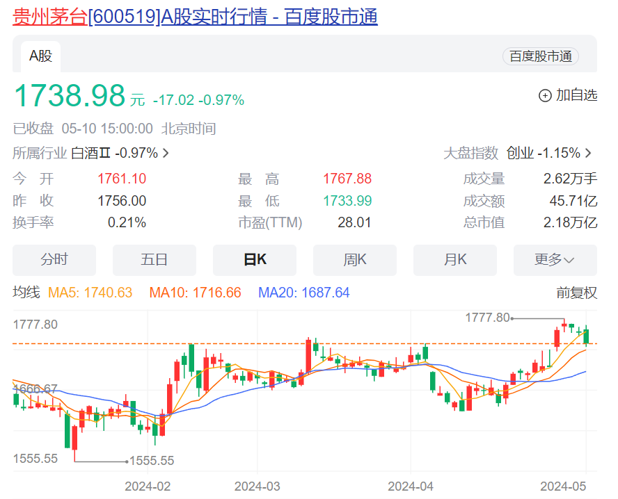 值得注意的是,茅台股价5月7日创出了近半年来的新高——1777.80元。但是,自5月8日茅台公告即将召开股东大会起,茅台股价已经连跌3天。对此,有来自湖南的网友在茅台股吧发帖,称:“完了,张德勤不给力啊市场不买账。跌成狗”(附注说明:网友发帖时将张董事长的名字写错了,应为张德芹)。