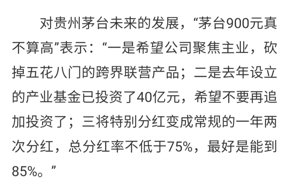 恰恰是在股东大会召开前夕,有茅台股东在接受《时代财经》采访时给出了三条建议,其中就包括打脸丁雄军的内容。这三条建议包括:“一是希望公司聚焦主业,砍掉五花八门的跨界联营产品;二是去年设立的产业基金已投资了40亿元,希望不要再追加投资了;三是将特别分红变成常规的一年两次分红,总分红率不低于75%,最好是能到85%。”