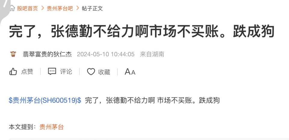 网友的评论虽然只是一家之言,“跌成狗”的评论也可能言过其实,但茅台股价在股东大会即将召开的消息公布之后不涨反跌,也算是市场情绪毫不掩饰的一种表达方式——