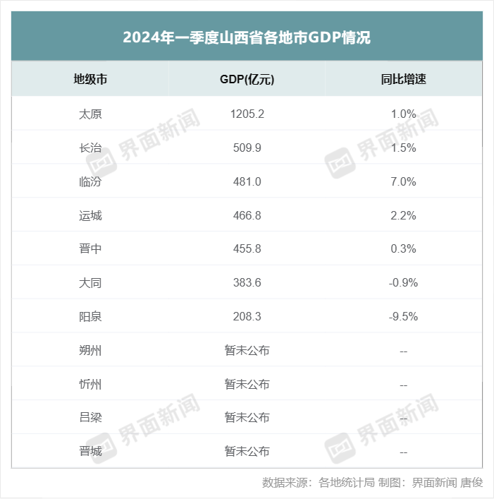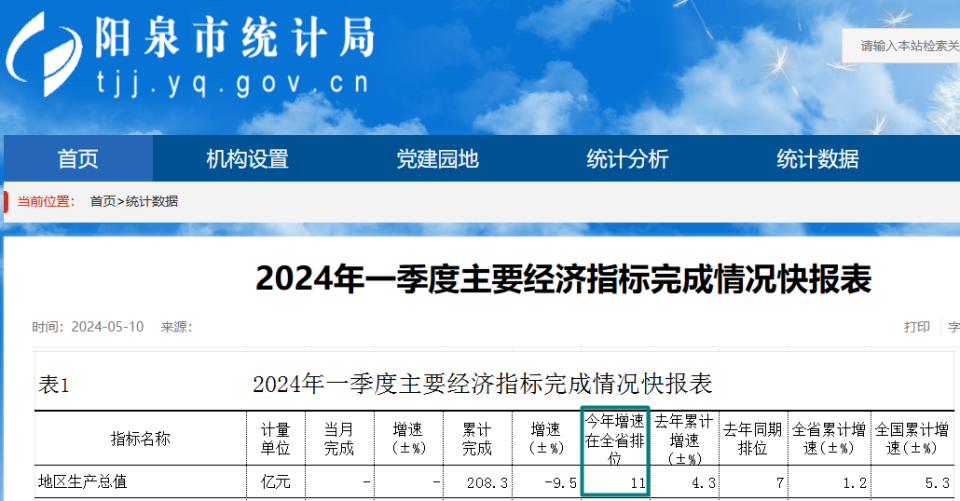 而阳泉一季度GDP则下降了9.5%,阳泉统计局数据显示,这一增速位列山西省第11名。山西省一共11个地级市,也就是说阳泉的经济增速在全省垫底。