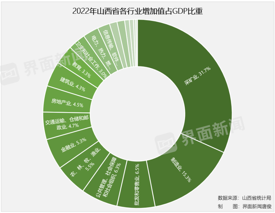 从细分行业来看,采矿业可以说是山西省的支柱产业。根据山西省统计年鉴,2022年,山西省GDP构成中31.7%来自采矿业,15.3%来自制造业。作为煤炭大省,煤炭开采是采矿业的主要部分,后续的煤炭加工又影响着制造业。