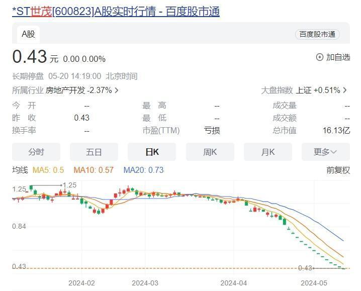 0.43元/股,这是世茂股份5月15日的收盘价,也是其在A股落幕的最终价格。