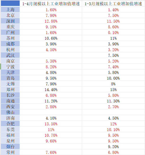 其中,1-4月,合肥规模以上工业增加值增长13.5%,比1-3月12%的增速加快了1.5个百分点;广州规模以上工业增加值增长了1.6%,相比1-3月的0.1%,也提高了1.5个百分点。这两个城市是万亿GDP城市中工业增速提高最多的城市。