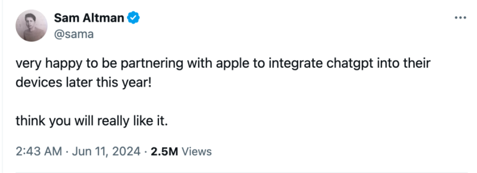 在大会结束后,山姆通过个人社交媒体发帖称:“非常开心与苹果达成伙伴关系,并将在今年晚些时候将ChatGPT嵌入他们的设备中。”