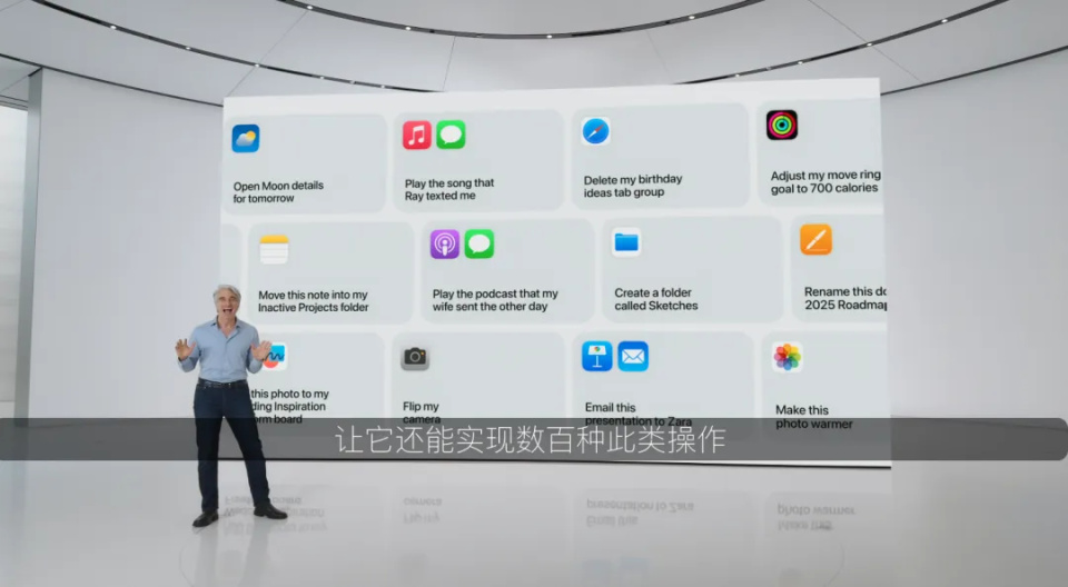 Siri的升级不可谓不多:苹果为其在主屏上设计了一个大光圈;基于Apple Intelligence能力,Siri具备了丰富的语义和大模型上下文理解能力,能理解用户对“那次”“那时”“那里”等代词的具体描述。在原本的语音交互外,Siri还将增加文字交互功能、跨App执行操作等新玩法。