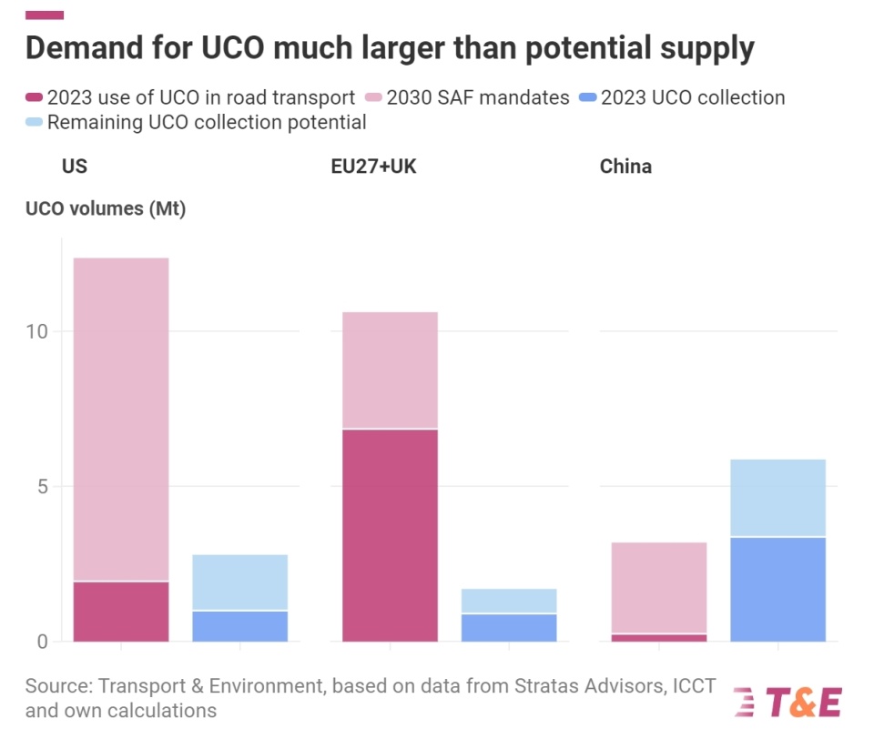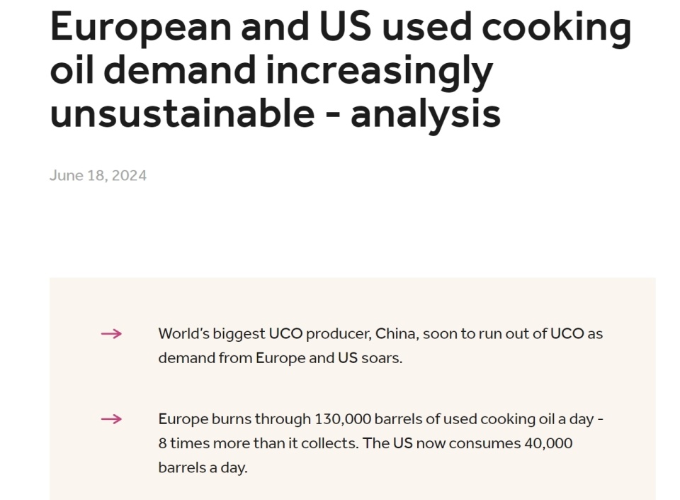 欧洲运输与环境联合会(T&E)周二发布报告称,随着欧洲和美国对进口“地沟油”生产燃料的需求激增,全球最大“地沟油”出口国——中国的供应很快将被耗尽。即便如此,要达成一系列“2030目标”,现有的“地沟油”供给已经处于完全跟不上的状态。